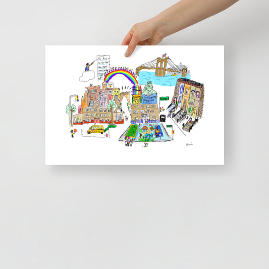 Our Spring 2026 Collection features artwork by TBBS parent, local business owner and artist, Mami Nagase. Titled "Walking on a rainbow towards hope; Together." this graphic depicts a wondrous sense of neighborhood, community and collaboration rooted in joy and optimism.